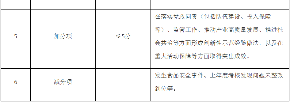 第五條 考核內(nèi)容主要包括食品安全基礎(chǔ)工作推進(jìn)、年度重點(diǎn)工作落實(shí)、食品安全狀況等,同時(shí)設(shè)置即時(shí)性工作評(píng)價(jià)和加減分項(xiàng)(考核內(nèi)容要點(diǎn)見附件)。具體考核指標(biāo)及分值在年度食品安全工作考核方案及其細(xì)則中明確,設(shè)置要科學(xué)合理,可操作、可評(píng)價(jià)、可區(qū)分,切實(shí)減輕基層負(fù)擔(dān)。