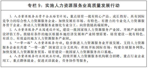 加快人力資源服務(wù)業(yè)高質(zhì)量發(fā)展。推動人力資源服務(wù)與實(shí)體經(jīng)濟(jì)融合發(fā)展,引導(dǎo)人力資源服務(wù)機(jī)構(gòu)圍繞產(chǎn)業(yè)基礎(chǔ)高級化、產(chǎn)業(yè)鏈現(xiàn)代化提供精準(zhǔn)專業(yè)服務(wù)。鼓勵(lì)人力資源服務(wù)業(yè)管理創(chuàng)新、技術(shù)創(chuàng)新、服務(wù)創(chuàng)新和產(chǎn)品創(chuàng)新,大力發(fā)展人力資源管理咨詢、高級人才尋訪、人才測評等高技術(shù)、高附加值業(yè)態(tài)。實(shí)施人力資源服務(wù)業(yè)領(lǐng)軍人才培養(yǎng)計(jì)劃。開展“互聯(lián)網(wǎng)+人力資源服務(wù)”行動。深化人力資源服務(wù)領(lǐng)域?qū)ν忾_放,探索建設(shè)國家人力資源服務(wù)出口基地。