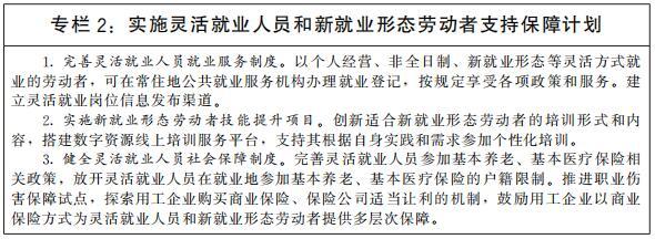 支持多渠道靈活就業(yè)和新就業(yè)形態(tài)發(fā)展。破除各種不合理限制,建立促進(jìn)多渠道靈活就業(yè)機(jī)制,支持和規(guī)范發(fā)展新就業(yè)形態(tài)。鼓勵(lì)傳統(tǒng)行業(yè)跨界融合、業(yè)態(tài)創(chuàng)新,增加靈活就業(yè)和新就業(yè)形態(tài)就業(yè)機(jī)會。加快落實(shí)《關(guān)于維護(hù)新就業(yè)形態(tài)勞動者勞動保障權(quán)益的指導(dǎo)意見》,建立完善適應(yīng)靈活就業(yè)和新就業(yè)形態(tài)的勞動權(quán)益保障制度,引導(dǎo)支持靈活就業(yè)人員和新就業(yè)形態(tài)勞動者參加社會保險(xiǎn),提高靈活就業(yè)人員和新就業(yè)形態(tài)勞動者社會保障水平。規(guī)范平臺企業(yè)用工,明確平臺企業(yè)勞動保護(hù)責(zé)任。健全職業(yè)分類動態(tài)調(diào)整機(jī)制,持續(xù)開發(fā)新職業(yè),發(fā)布新職業(yè)標(biāo)準(zhǔn)。