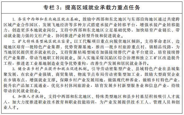 推動區(qū)域就業(yè)協(xié)調(diào)發(fā)展。支持東部地區(qū)發(fā)揮創(chuàng)新要素集聚優(yōu)勢,率先實(shí)現(xiàn)產(chǎn)業(yè)升級,開拓高質(zhì)量就業(yè)新領(lǐng)域,培育高質(zhì)量就業(yè)增長極。加快完善中西部和東北地區(qū)基礎(chǔ)設(shè)施,提升產(chǎn)業(yè)集聚區(qū)公共服務(wù)效能,引導(dǎo)產(chǎn)業(yè)向中西部和東北地區(qū)有序梯度轉(zhuǎn)移,推動就業(yè)機(jī)會向中西部和東北地區(qū)擴(kuò)散。支持中西部和東北地區(qū)根據(jù)國家戰(zhàn)略導(dǎo)向和發(fā)展重點(diǎn),對接先進(jìn)生產(chǎn)要素和創(chuàng)新資源,發(fā)展特色優(yōu)勢產(chǎn)業(yè),改造提升傳統(tǒng)產(chǎn)業(yè),積極布局新興產(chǎn)業(yè),厚植就業(yè)創(chuàng)業(yè)沃土。