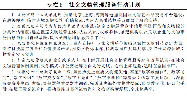 堅(jiān)持社會(huì)效益優(yōu)先,加強(qiáng)對(duì)民間收藏的指導(dǎo)、管理和服務(wù),健全文物合法流通交易體制機(jī)制,優(yōu)化文物鑒定服務(wù)和文物進(jìn)出境監(jiān)管,完善流失文物追索返還制度。