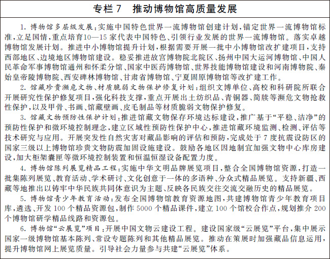 實(shí)施中國(guó)特色世界一流博物館創(chuàng)建計(jì)劃。支持省級(jí)、重要地市級(jí)博物館特色化發(fā)展。盤活基層博物館資源。探索建立行業(yè)博物館聯(lián)合認(rèn)證、共建共管機(jī)制。規(guī)范和扶持非國(guó)有博物館發(fā)展,落實(shí)支持政策,依法依規(guī)推進(jìn)非國(guó)有博物館法人財(cái)產(chǎn)權(quán)確權(quán)。認(rèn)真履行相關(guān)審批程序,有序推動(dòng)建設(shè)一批反映黨和國(guó)家建設(shè)成就的當(dāng)代主題博物館和行業(yè)博物館,重點(diǎn)支持建設(shè)反映中華文明發(fā)展歷程的國(guó)家級(jí)重點(diǎn)專題博物館,倡導(dǎo)建設(shè)特色專題博物館。探索在文化資源豐厚地區(qū)建設(shè)“博物館之城”。