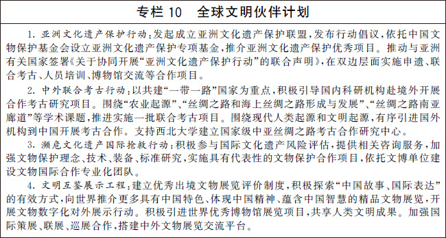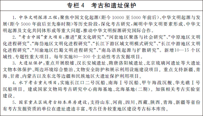 編制并實(shí)施“十四五”考古工作專項(xiàng)規(guī)劃。系統(tǒng)確定考古發(fā)掘重點(diǎn),深化中華文明探源工程,推進(jìn)“考古中國(guó)”重大項(xiàng)目,科學(xué)闡釋中國(guó)境內(nèi)人類起源、文明起源、中華文明形成、統(tǒng)一多民族國(guó)家建立和發(fā)展、中華文明在世界文明史中的重要地位等關(guān)鍵問(wèn)題,揭示中華文明的歷史文化價(jià)值和核心特質(zhì)。