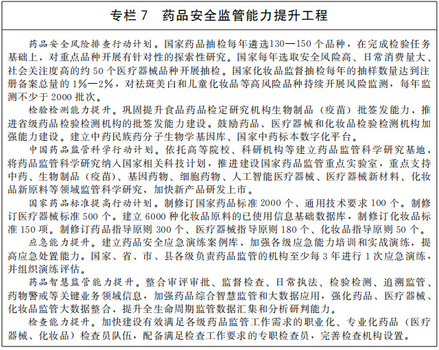 完善藥品安全監(jiān)管制度。加強藥物臨床試驗核查,嚴格執(zhí)行藥品、醫(yī)療器械、化妝品等生產(chǎn)質量管理規(guī)范,對重點生產(chǎn)企業(yè)開展全覆蓋檢查。開展藥品質量提升行動,健全生物制品等高風險產(chǎn)品標準制定工作機制,提高藥品、醫(yī)療器械、化妝品標準。改革和完善疫苗監(jiān)管體制機制,提高省級藥品檢驗檢測機構對轄區(qū)內(nèi)生產(chǎn)的主要疫苗品種批簽發(fā)能力。深入開展無菌植入性醫(yī)療器械監(jiān)督檢查、化妝品“線上凈網(wǎng)、線下清源”等專項整治行動,切實規(guī)范藥品、醫(yī)療器械、化妝品市場秩序。