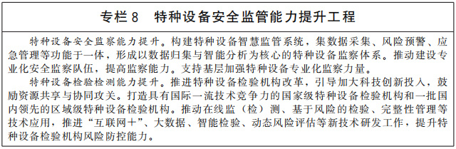 強化特種設備安全風險監(jiān)控體系建設。優(yōu)化特種設備監(jiān)管信息化建設基礎和應用環(huán)境,推動國家與地方監(jiān)管數(shù)據(jù)互聯(lián)互通,增強數(shù)據(jù)分析和信用管理功能,完善全國統(tǒng)一的特種設備信息公示查詢系統(tǒng)。加強特種設備風險預警與應急處置能力建設,提高安全風險識別和防控能力。推動特種設備使用單位開展風險分級管控,從源頭上系統(tǒng)辨識風險、防控風險。完善生產(chǎn)單位、檢驗檢測機構和人員資格信息等特種設備基礎數(shù)據(jù)庫。以電梯、氣瓶和移動式壓力容器、叉車等為重點,建立健全特種設備質量安全管理追溯體系。推動特種設備生產(chǎn)企業(yè)加大研發(fā)投入,建立科學嚴密、反應及時的風險防范系統(tǒng)。完善鍋爐安全、節(jié)能、環(huán)保三位一體的監(jiān)管體系,以實現(xiàn)碳達峰碳中和目標為導向,進一步提升鍋爐節(jié)能環(huán)保水平。