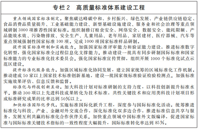 深化標準化改革創(chuàng)新。加快標準供給由政府主導向政府與市場并重轉變,標準運用由產(chǎn)業(yè)與貿(mào)易為主向經(jīng)濟社會全域轉變,標準化工作由國內(nèi)驅動向國內(nèi)國際相互促進轉變,標準化發(fā)展由數(shù)量規(guī)模型向質量效益型轉變。持續(xù)優(yōu)化政府頒布標準與市場自主制定標準協(xié)調配合的新型標準體系,推動一般性產(chǎn)品、服務標準由市場自主制定,建立健全政府頒布標準采信市場自主制定標準的機制。建立法規(guī)引用標準制度,強化法規(guī)與標準有效協(xié)調機制,運用標準支撐法規(guī)落地實施。加強標準化技術組織建設,提升國家標準研制和實施能力。加強國家技術標準創(chuàng)新基地和國家級標準驗證檢驗檢測點建設,提升標準化技術支撐水平。實施標準全生命周期閉環(huán)管理,完善標準實施信息反饋與評估制度,建立國家標準動態(tài)維護機制。開展對標達標專項行動,推動團體標準培優(yōu)計劃和企業(yè)標準領跑者制度實施,消除標準制定團體培育發(fā)展的政策障礙,釋放企業(yè)、社會團體標準化活力。
