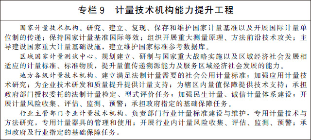 (二十一)加快計(jì)量技術(shù)機(jī)構(gòu)建設(shè)。深化計(jì)量技術(shù)機(jī)構(gòu)改革創(chuàng)新發(fā)展,優(yōu)化整合國(guó)家計(jì)量技術(shù)機(jī)構(gòu)、區(qū)域國(guó)家計(jì)量測(cè)試中心、地方各級(jí)計(jì)量技術(shù)機(jī)構(gòu)和行業(yè)主管部門專業(yè)計(jì)量技術(shù)機(jī)構(gòu)。大力推動(dòng)國(guó)家計(jì)量技術(shù)機(jī)構(gòu)創(chuàng)新發(fā)展,通過組織開展重大測(cè)量原理、方法前沿技術(shù)攻關(guān),建立量子計(jì)量基準(zhǔn)并保持國(guó)際等效,提供一流的量值溯源和測(cè)量服務(wù),支撐國(guó)家科技創(chuàng)新、工業(yè)競(jìng)爭(zhēng)力提升和經(jīng)濟(jì)社會(huì)發(fā)展。充分發(fā)揮省級(jí)人民政府和行業(yè)主管部門計(jì)量基礎(chǔ)設(shè)施規(guī)劃建設(shè)自主權(quán),加強(qiáng)普惠性、基礎(chǔ)性和公益性計(jì)量基礎(chǔ)設(shè)施建設(shè)。提升計(jì)量技術(shù)機(jī)構(gòu)服務(wù)市場(chǎng)的能力和水平,推動(dòng)形成一批專業(yè)領(lǐng)域服務(wù)平臺(tái),培育一批專業(yè)化、社會(huì)化、網(wǎng)絡(luò)化的服務(wù)機(jī)構(gòu),為經(jīng)濟(jì)社會(huì)發(fā)展和行業(yè)創(chuàng)新提供計(jì)量測(cè)試服務(wù)。