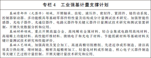(九)支撐先進(jìn)制造與質(zhì)量提升。實(shí)施制造業(yè)計(jì)量能力提升工程,建立一批先進(jìn)制造業(yè)發(fā)展急需的高準(zhǔn)確度、高穩(wěn)定性計(jì)量基準(zhǔn)、標(biāo)準(zhǔn)。在戰(zhàn)略性新興產(chǎn)業(yè)和現(xiàn)代服務(wù)業(yè)等領(lǐng)域,建設(shè)一批國(guó)家產(chǎn)業(yè)計(jì)量測(cè)試中心和聯(lián)盟,搭建計(jì)量公共服務(wù)平臺(tái),聚焦制造業(yè)領(lǐng)域測(cè)不了、測(cè)不全、測(cè)不準(zhǔn)難題,加強(qiáng)關(guān)鍵計(jì)量測(cè)試技術(shù)、測(cè)量方法研究和裝備研制,為產(chǎn)業(yè)發(fā)展提供全溯源鏈、全產(chǎn)業(yè)鏈、全壽命周期并具有前瞻性的計(jì)量測(cè)試服務(wù)。開展產(chǎn)業(yè)計(jì)量基礎(chǔ)能力提升行動(dòng),實(shí)施工業(yè)強(qiáng)基計(jì)量支撐計(jì)劃,充分發(fā)揮計(jì)量對(duì)基礎(chǔ)零部件(元器件)、基礎(chǔ)材料、基礎(chǔ)工藝的技術(shù)支撐和保障作用。研究建立國(guó)家工業(yè)計(jì)量基礎(chǔ)數(shù)據(jù)庫(kù),加強(qiáng)工業(yè)制造領(lǐng)域計(jì)量檢定、校準(zhǔn)、測(cè)試和檢測(cè)數(shù)據(jù)的采集、管理和應(yīng)用。