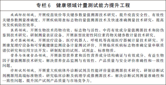 (十五)服務(wù)大眾健康與安全。加快醫(yī)療健康領(lǐng)域計(jì)量服務(wù)體系建設(shè),圍繞疾病防控、生物醫(yī)藥、診斷試劑、高端醫(yī)療器械、康復(fù)理療設(shè)備、可穿戴設(shè)備、營(yíng)養(yǎng)與保健食品等開展關(guān)鍵計(jì)量測(cè)試技術(shù)研究和應(yīng)用。加強(qiáng)體育設(shè)施和器材計(jì)量技術(shù)研究和測(cè)試服務(wù),促進(jìn)體育產(chǎn)業(yè)高質(zhì)量發(fā)展。完善地質(zhì)和海洋災(zāi)害、地震、洪澇干旱、森林草原火災(zāi)等自然災(zāi)害防御的計(jì)量保障體系,提高防災(zāi)、減災(zāi)、救災(zāi)計(jì)量能力。加強(qiáng)危險(xiǎn)化學(xué)品、礦山、建筑施工、地質(zhì)勘查等安全生產(chǎn)相關(guān)計(jì)量器具的研制生產(chǎn)和監(jiān)督管理。加強(qiáng)公共安全領(lǐng)域計(jì)量服務(wù)體系建設(shè),開展交通安全、社會(huì)穩(wěn)定和安全等領(lǐng)域關(guān)鍵計(jì)量測(cè)試技術(shù)研究和應(yīng)用,推進(jìn)交通監(jiān)管設(shè)備、警用裝備、刑事技術(shù)產(chǎn)品等計(jì)量測(cè)試基礎(chǔ)設(shè)施建設(shè)。