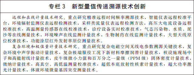 (六)開展新型量值傳遞溯源技術(shù)研究。針對(duì)復(fù)雜環(huán)境、實(shí)時(shí)工況環(huán)境和極端環(huán)境的計(jì)量需求,研究新型量值傳遞溯源方法,解決綜合參量的準(zhǔn)確測(cè)量難題。建立扁平化場(chǎng)景高適應(yīng)性的量值溯源體系。研究數(shù)字化模擬測(cè)量、工業(yè)物聯(lián)、跨尺度測(cè)量、復(fù)雜系統(tǒng)綜合計(jì)量等關(guān)鍵技術(shù)。加強(qiáng)國(guó)家標(biāo)準(zhǔn)物質(zhì)在制備、定值、保存、溯源評(píng)價(jià)及量值傳遞應(yīng)用新模式等方面的全壽命周期、系統(tǒng)性研究與評(píng)價(jià)。加快推進(jìn)計(jì)量基準(zhǔn)、計(jì)量標(biāo)準(zhǔn)及標(biāo)準(zhǔn)物質(zhì)智能化、網(wǎng)絡(luò)化技術(shù)的研究和應(yīng)用。