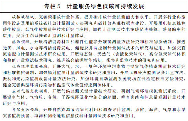 (十四)支撐碳達(dá)峰碳中和目標(biāo)實(shí)現(xiàn)。完善溫室氣體排放計(jì)量監(jiān)測(cè)體系,加強(qiáng)碳排放關(guān)鍵計(jì)量測(cè)試技術(shù)研究和應(yīng)用,健全碳計(jì)量標(biāo)準(zhǔn)裝置,為溫室氣體排放可測(cè)量、可報(bào)告、可核查提供計(jì)量支撐。建立碳排放計(jì)量審查制度,強(qiáng)化重點(diǎn)排放單位的碳計(jì)量要求。在城市和園區(qū)開展低碳計(jì)量試點(diǎn)。建立完善資源環(huán)境計(jì)量體系,建設(shè)一批國(guó)家能源、水文水資源和環(huán)境計(jì)量中心,推進(jìn)能耗、水資源、環(huán)境監(jiān)測(cè)系統(tǒng)建設(shè),加強(qiáng)能源資源和環(huán)境計(jì)量數(shù)據(jù)分析挖掘和利用。加快推進(jìn)能源資源計(jì)量服務(wù)示范工程建設(shè),引導(dǎo)和培育能源資源和環(huán)境計(jì)量服務(wù)市場(chǎng)。